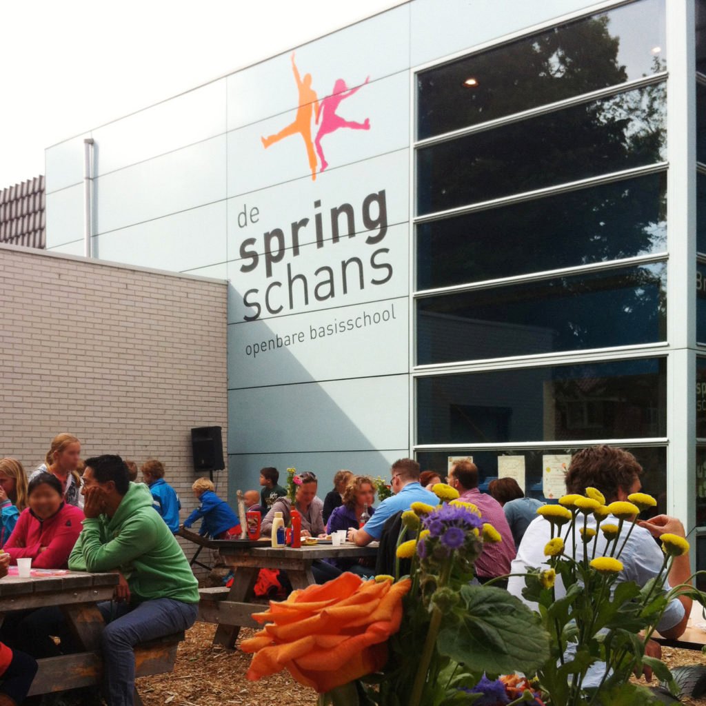 De huisstijl van basisschool De Springschans heeft een duidelijke beeldtaal, vorm- en kleurelementen.